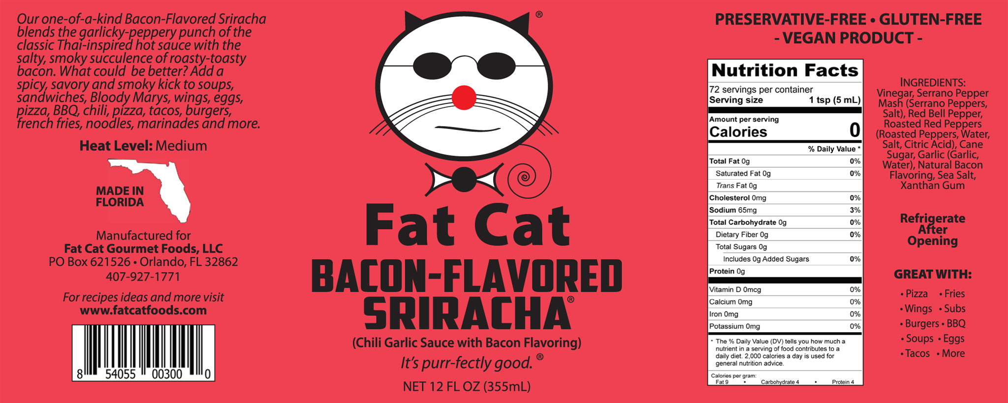 • Bacon-Flavored Sriracha Chili Garlic Sauce with Bacon Flavoring (Vegan) - Fat Cat Gourmet Hot Sauce & Specialty Condiments